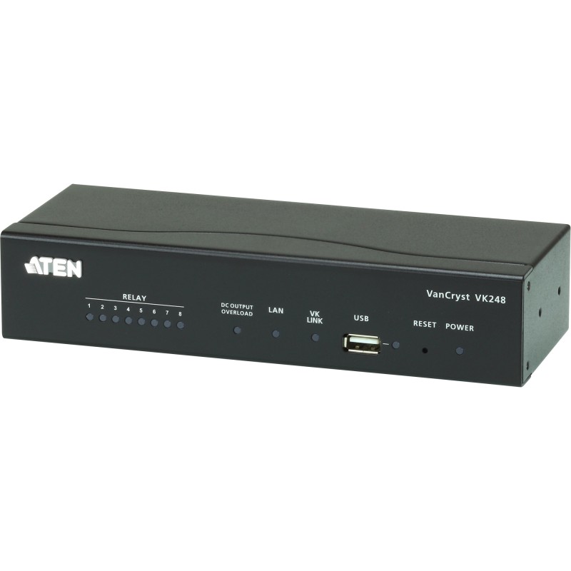 Die VK248 8-Kanal Relais Erweiterungsbox bietet zusätzliche 8 Kanäle Relaisausgang für eine flexible Erweiterung des ATEN Kontrollsystems. Damit können Anwender zusätzliche Geräte wie z.B. Bildschirme, Projektorheber und Jalousien in Umgebungen einsetzen, wo mehr Geräte benötigt werden. Mit dem Vorteil einer Ethernet-basierten Verbindung kann die Erweiterungsbox ganz einfach mit der VK2100 Kontrollbox über eine LAN Verbindung von einer Vielzahl von Standorten im gesamten Netzwerk verbunden werden.Bietet 8 Relaiskanäle zur Erweiterung des ATEN KontrollsystemsBis zu 8 VK248 Erweiterungsboxen können zu einer einzelnen VK2100 Kontrollbox hinzugefügt werdenFlexibler Einsatz: Verbindet sich mit einer VK2100 Kontrollbox über eine Ethernet VerbindungID Switch koppelt die VK248 mit einem Controller zur sofortigen Konfiguration der NetzwerkeinstellungenBietet Gleichstrom zum Betrieb eines Wechselstrom-Relaismodus oder einem anderen GerätUnterstützt Power over Ethernet (PoE) oder GleichstromversorgungFirmware Upgrade möglich über USB oder WebschnittstelleLieferumfang:1x VK248 8-Kanal Relais Erweiterungsbox1x Montageset9x Anschlussblöcke1x BenutzeranleitungSchnittstellenRelais• 8 schließende Relais (8 x 2-poliger Anschlussblock)• Kontaktnennwert: Max 24 VDC, 2AEthernet• 1 x RJ-45 Buchse, 10/100 Base-T • Unterstütztes Protokoll: ICMP, TCP/IP, DHCP, HTTPS, SSH • DHCP-aktiviert. Die folgenden Standard IP-Einstellungen werden verwendet, wenn innerhalb von 30 Sekunden keine IP zugewiesen wird: IP: 192.168.0.60 Subnetzmaske: 255.255.255.0SchalterController-ID1 x 16-Segmente-SwitchExpander ID1 x 8-Segmente-SwitchReset-Taste1 x Halb eingelassene DrucktasteUSB1 x USB-Typ-A (Nur Firmware Upgrade fehlgeschlagen)StromverbrauchDC5V:2.82W:24BTUUmgebungBetriebstemperatur0 – 50°CAufbewahrungstemperatur–20 – 60°CFeuchtigkeit0 - 80% relative Luftfeuchte, nicht kondensierendStromversorgungAusgang12 V Gleichspannung, 300 mAPhysikalische EigenschaftenGehäuseMetallGewicht0.65 kg ( 1.43 lb )Abmessungen (L x B x H)20.00 x 7.58 x 4.20 cm (7.87 x 2.98 x 1.65 in.)HinweisBei einigen Rack-Mount Produkten ist zu beachten, dass die üblichen Abmessungen von BxTxH in einem LxBxH-Format angegeben werden.