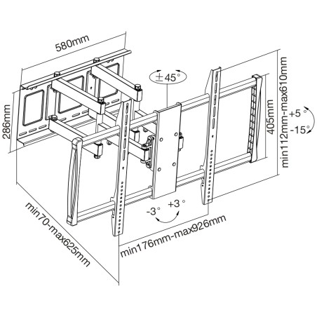 - Inclinaison : -15° à +5°, plage de pivotement : -45° à +45° (selon l'écran)